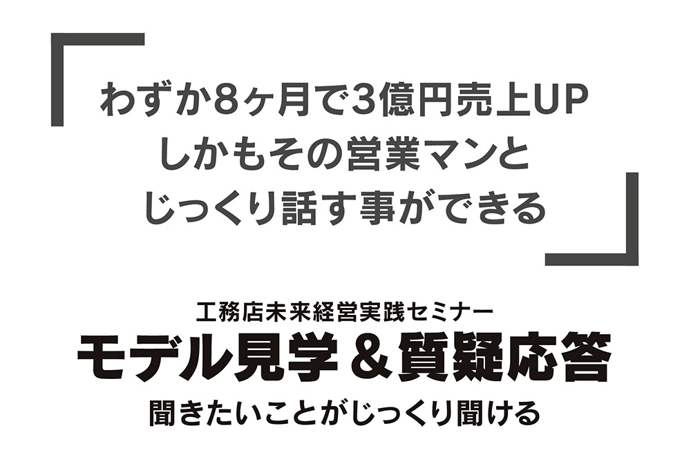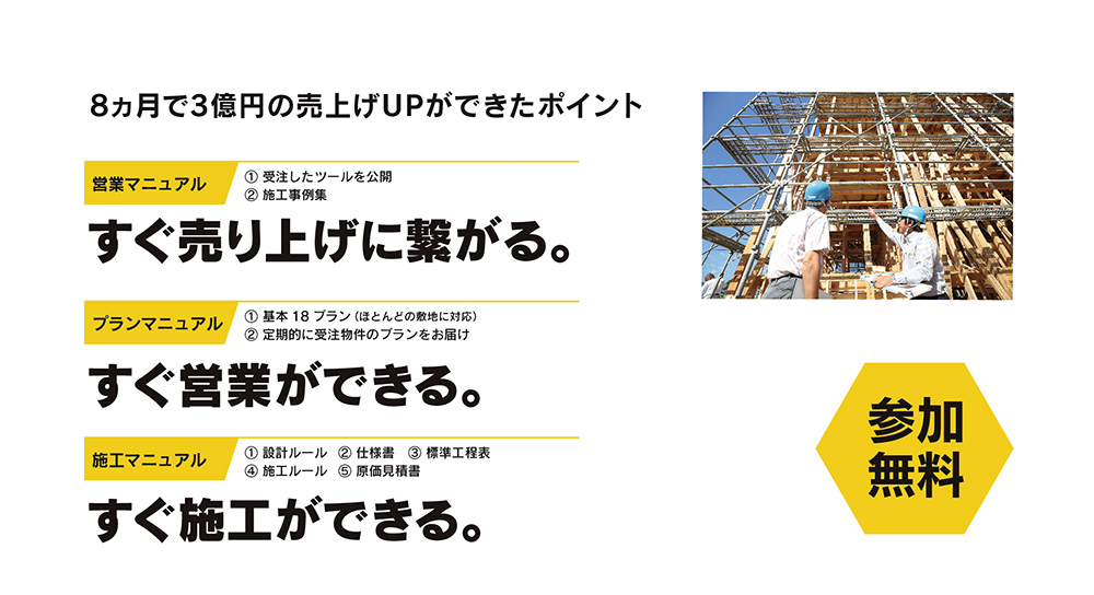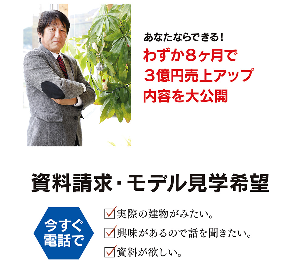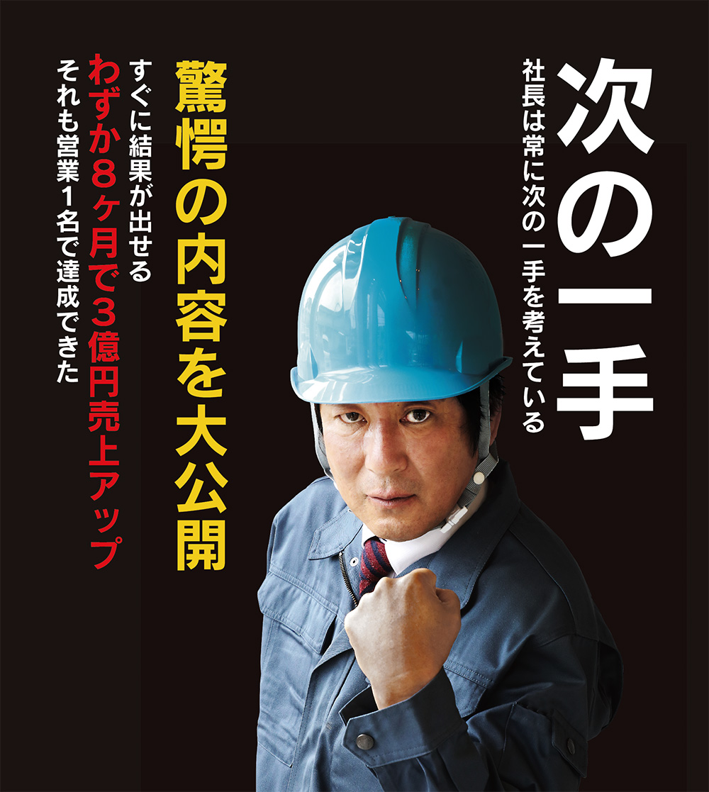 アパート市場は逆風と言われている市場で8ヵ月で3億円の売り上げアップができたポイント、それは 空室率が軽減できるロフト付ワンルーム「ロフティ」。入居募集から空室待ちの人気です。あまりの高利回りにアパートオーナーが2物件、3物件と依頼をしてきています。更に、今まで接点のあるOB、YB、金融機関協力業者への営業活動だけでも案件が発生。そのうえ木造アパートなので施工体制はそのままで、素早く事業を安定させます。